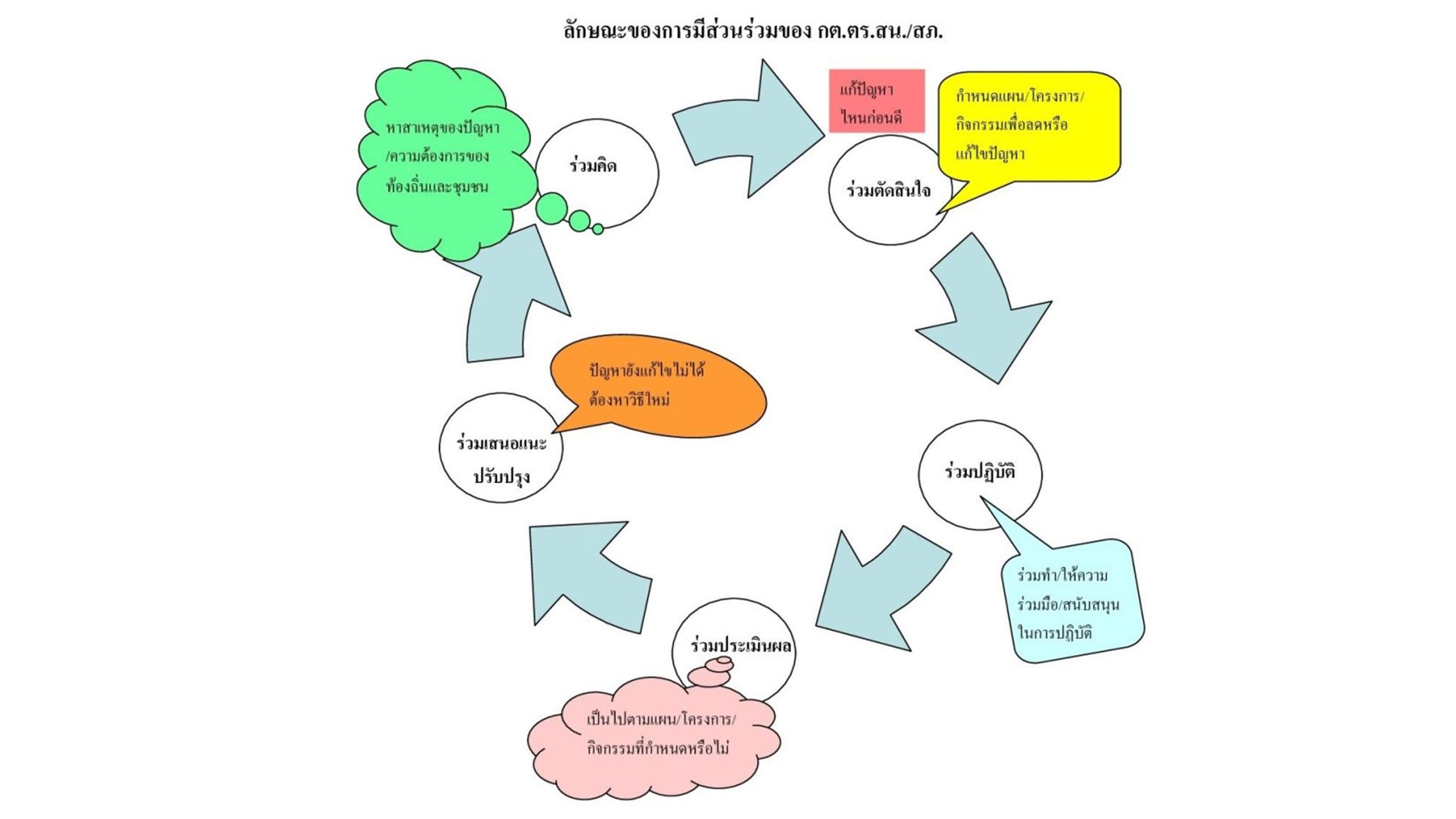 1) มีส่วนร่วมในการคิด ศึกษาและค้นคว้าหาสภาพและสาเหตุของปัญหาตลอดจนความต้องการของท้องถิ่นและชุมชน