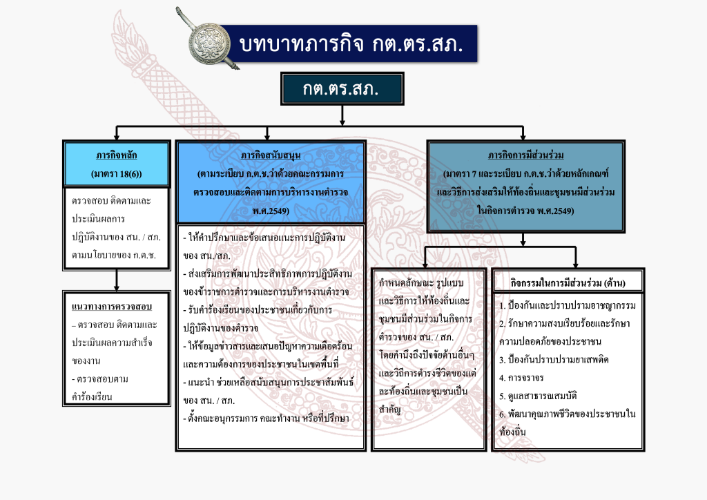1. ภารกิจหลัก ตามมาตรา 18 (6 แห่ง พ.ร.บ.ตำรวจแห่งชาติ พ.ศ. 2547 กำหนดให้ กต.ตร.กทม. กต.ตร.จังหวัดและ กต.ตร.สถานีตำรวจ มีบทบาทภารกิจในการตรวจสอบ ติดตามและประเมินผลการปฏิบัติงานของ บช.น. / ภ.จว. ให้เป็นไปตามนโยบายของ ก.ต.ช. และการบริหารราชการตำรวจให้เป็นไปตาม พ.ร.บ.ตำรวจแห่งชาติ และกฎหมายอื่น ซึ่ง ก.ต.ช. ได้กำหนดอำนาจหน้าที่ของ กต.ตร.กทม,/จังหวัด และสถานีตำรวจในเรื่องดังกล่าว ไว้ในระเบียบ ก.ต.ช. ว่าด้วยคณะกรรมการตรวจสอบและติดตามการบริหารงานตำรวจ พ.ศ. 2549